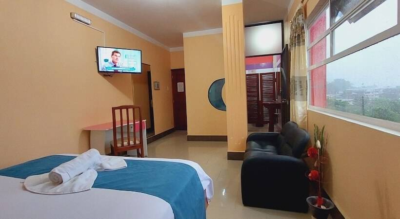 Hotel Platinum Class has a restaurant, bar, a shared lounge and garden in Nueva Loja. Boasting family rooms, this property also provides guests with a terrace. The accommodation features a 24-hour front desk, room service and currency exchange for guests. At the hotel rooms have air conditioning, a seating area, a flat-screen TV with cable channels, a kitchen, a dining area and a private bathroom with a hairdryer, a shower and free toiletries. The rooms come with a coffee machine, while certain rooms come with a patio and others also boast garden views. The rooms will provide guests with a microwave. An American breakfast is available each morning at Hotel Platinum Class. Samana is 11 km from the accommodation, while Shushufindi is 39 km from the property.