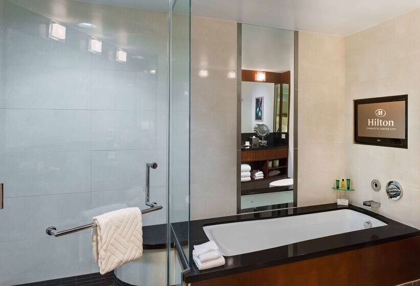 מלון הילטון שארלוט אפטאון (Hilton Charlotte Uptown) ממוקם באופן מושלם במרכז העיר שארלוט (Charlotte), ממש מול מרכז הכנסים שארלוט (Charlotte Convention Center) ובמרחק 480 מ‘ בלבד מהספקטרום סנטר (Spectrum Center), ומציע מגוון רחב של שירותים מודרניים ואביזרי נוחות חדישים ומתקדמים. האטרקציות הפופולריות באזור כוללות את אצטדיון הכדורגל של בנק אמריקה (Bank of America Football Stadium) ומרכז בלומנטל לאמנויות הבמה (Blumenthal Performing Arts Center), שנמצאים במרחק הליכה קצרה. בקרבת מקום תמצאו גם מטות עולמיים של מספר חברות כמו וולס פארגו (Wells Fargo) ובנק אמריקה (Bank of America). המלון מקושר בנוחות למועדון הבריאות YMCA, שכולל ציוד ומתקנים חדישים ביותר. מקום האירוח מציע חדרים מרווחים המרוהטים בטכנולוגיות החדישות ביותר, כולל טלוויזיות עם מסך שטוח, מכשירי רדיו תואמי MP3 וגישה לאינטרנט אלחוטי. המלון מתהדר גם במתקני פגישות ואירועים מרווחים ורב-תכליתיים בשילוב עם צוות אירועים מקצועי.